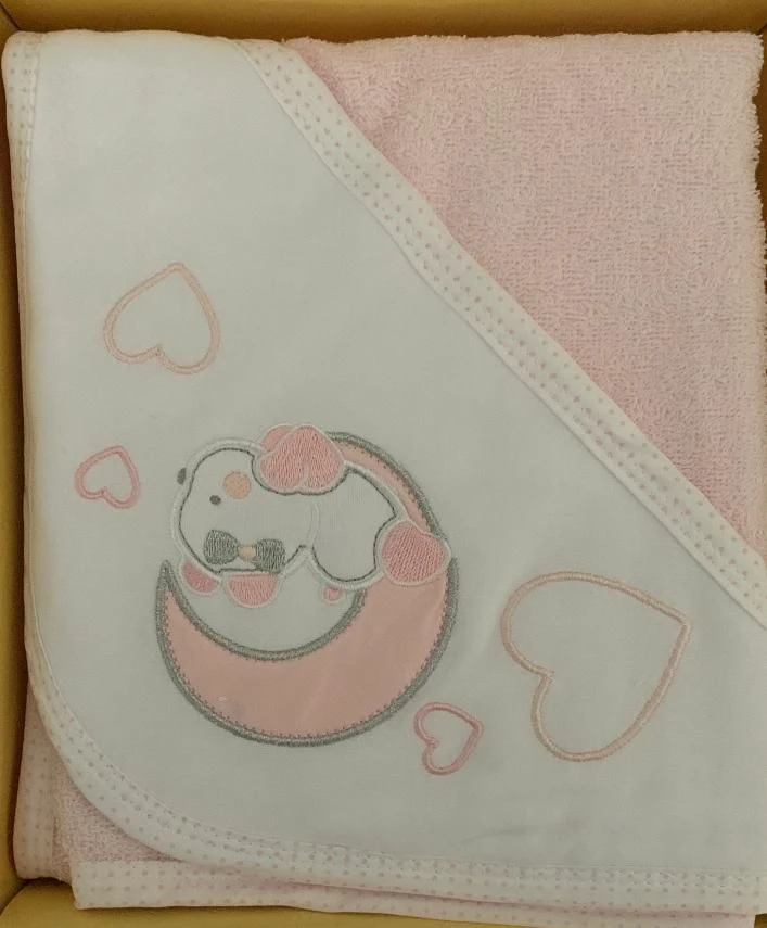 Accappatoio triangolo spugna Neonata fondo Bianco e Rosa