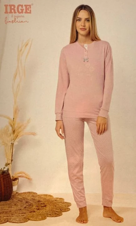 Pigiama Donna 100% cotone jersey Irge 2321 maglia serafino ricamata con polsi e bordo in vita pantalone fantasia curi piccoli con polsi alla caviglia. Composizione 100% cotone jersey leggero Disponibile nelle Taglie S/42 M/44 L/46 XL/48 XXL/50 Blu e Rosa antico