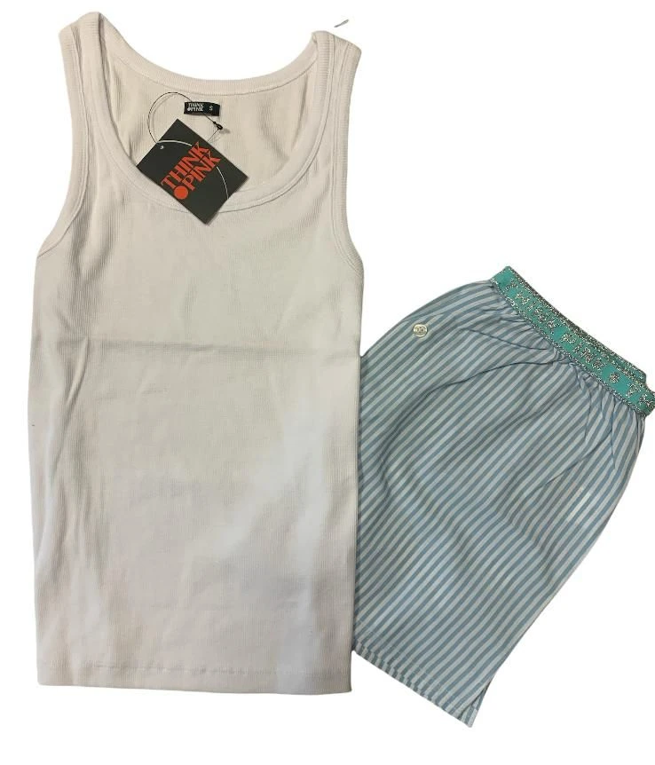 Pigiama Donna canottiera corto 100% cotone THINK PINK 2023 Outlet canottiera spalla larga costine e pantalone corto stoffa rigato con elastico con scritta.