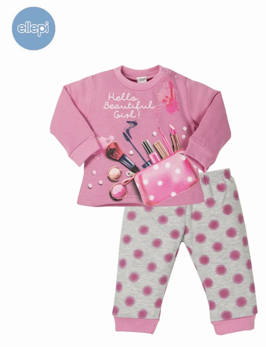 Bellissimo pigiama neonata cotone felpato caldo invernale morbido naturale ed anallergico con maglia girocollo stampata con bottoni laterali a pressione bordato ai polsi ed in vita e pantalone fatasia poiscon bordo alle caviglie in contrasto . Massimo confort